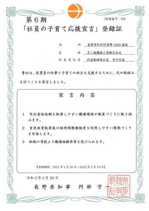 長野県による「社員の子育て応援宣言」に6期目の内容が登録されました。