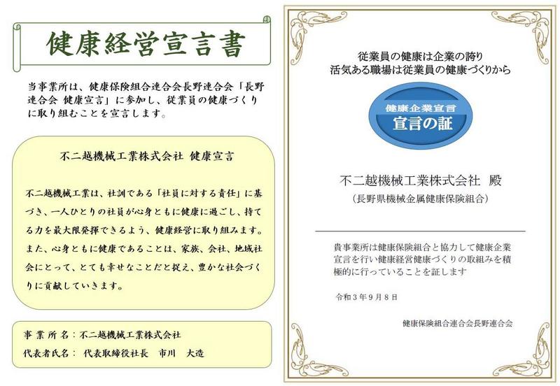 不二越機械工業は、健康保険組合連合会長野連合会「長野連合会 健康宣言」に参加し、従業員の健康づくりに取り組むことを宣言し、経済産業省が推奨する「健康経営優良法人2022」の取得を目指します。
